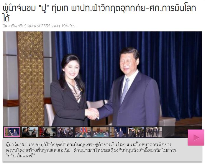 ผู้นำจีนชม"นายกฯปู"ฝ่าวิกฤตน้ำท่วมใหญ่-เศรษฐกิจการเงินโลก แนะตั้ง“ธนาคารเพื่อการลงทุนโครงสร้างพื้นฐานแห่งเอเชีย” ด้านนายกฯไทยขอเสียงจีนหนุนชิงเก้าอี้สมาชิกไม่ถาวรใน"ยูเอ็นเอสซี"