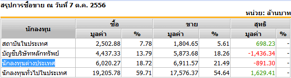 สรุปการซื้อขาย ณ วันที่ 7 ต.ค. 2556
