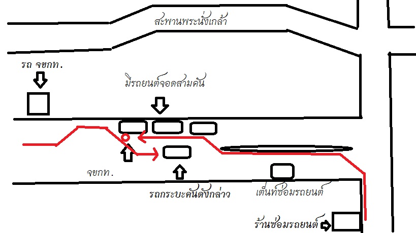 รถยนต์ที่จอดอยู่ชะลอนิดนึงทำท่าเหมือนจะจอดแต่ยังไม่จอดสนิท จังหวะที่ผมเดินมาถึงที่ท้ายรถที่จอดอยู่คันสุดท้าย (ผมเข้าใจว่ากระบะสี