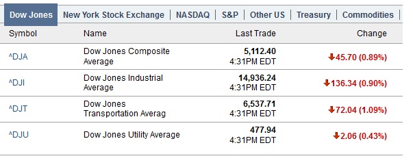 ดัชนีเฉลี่ยอุตสาหกรรมดาวโจนส์ปิดที่ 14,936.24 จุด ร่วงลง 136.34 จุด หรือ -0.90% ดัชนี S&P500 ปิดที่ 1,676.12 จุด ลดลง 14.38 จุด หรือ -0.85% ดัชนี NASDAQ ปิดที่ 3,770.38 จุด ลดลง 37.37 จุด หรือ -0.98%