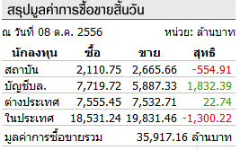เว็บไซต์ตลาดหลักทรัพย์แห่งประเทศไทย รายงานสรุปการซื้อขายหลักทรัพย์ โดยแบ่ง ตามประเภทนักลงทุน ประจำวันที่ 16 เมษายน 2557 ดังนี้ กลุ่ม ปริมาณซื้อ % ปริมาณขาย % สุทธิ (ลบ.) (ลบ.) (ลบ.) นักลงทุนสถาบัน 2,