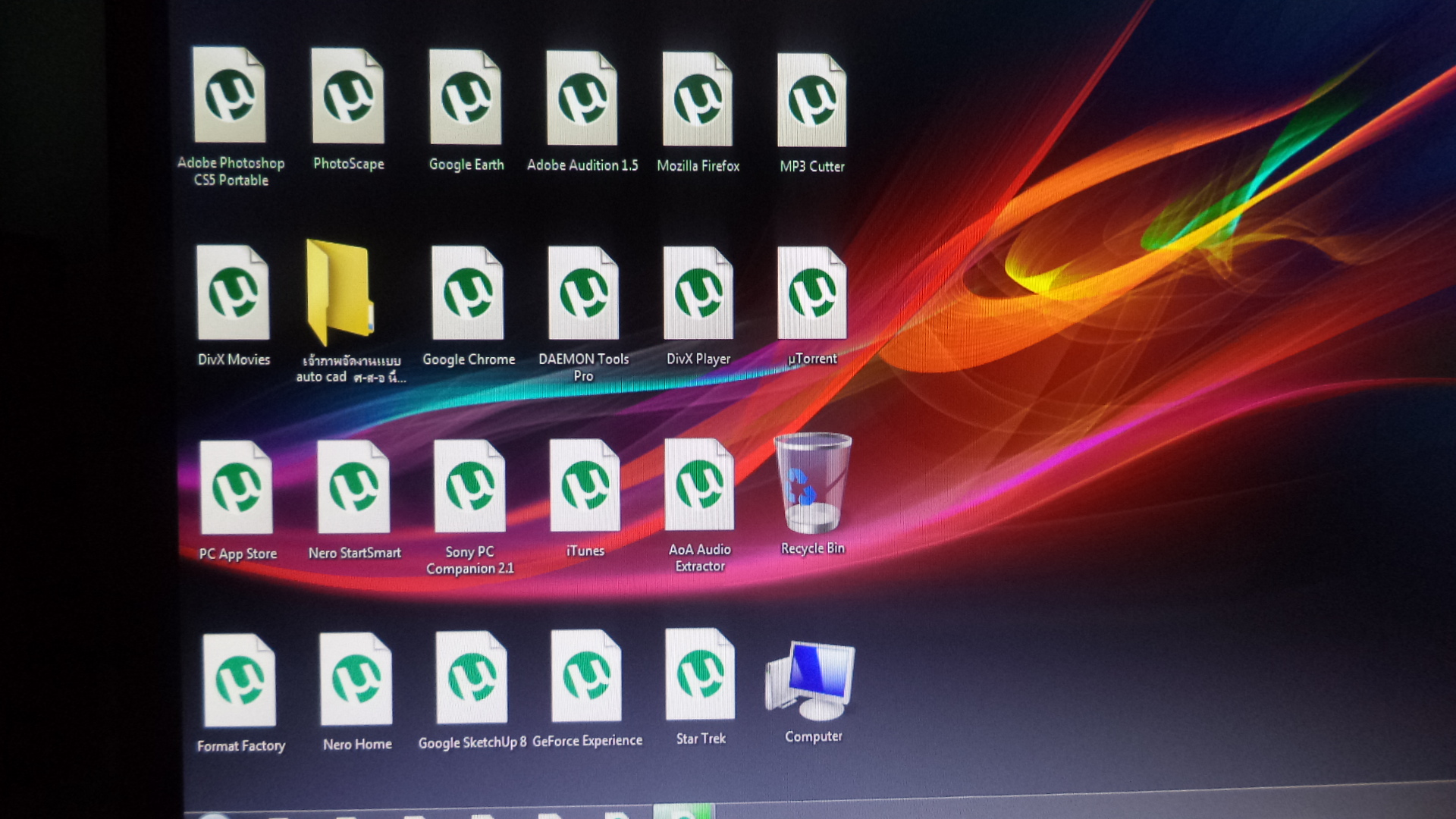 ไม่ทราบว่าเกิดจากอาการอะไรครับ เรื่องมีอยู่ว่าตอนแรกผมหาไฟล์งาน autocad ผม seach หาใน my computer จากนั้นเจอไฟล์ที่เป็นคล้ายๆ shortcut ผมเลยกดเปิดคิดว่าคงเปิดใน cad ได้ จากนั้น ไอคอน บน desktop ก็กลายเป็น ไอคอน โปรแกรม autocad หมดเลย กดทำอะไรไม่ได้ ต้องเปิดจาก auto cad อย่างเดียวเลยครับ ทีนี่ผมก็เลยลบโปรแกรม auto cad ทิ้งไป เผื่อไอคอน desktop จะกลับมาดังเดิม แต่ไม่ใช่ครับ มันกลายเป็น ไอคอน ธรรมดา สีขาวๆมีแค่ชื่อโปรแกรม เข้าไปกด มันจะกดไม่ได้เลย ตามรูปที่แนบครับ (อันนี้เป็นรูป ไอคอน โปรแรม utorrent เพราะเราเปิดไฟล์อะไร โปรแกรมไหน มันจะถามทุกครั้งแบบนี้ครับ)