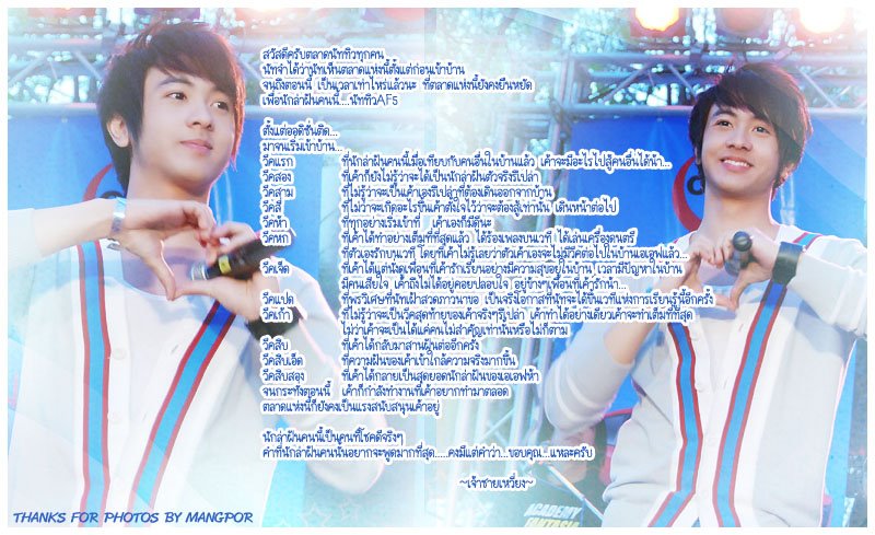 ตามหัวกระทู้เลยฮะ "คุณชอบ/เชียร์/โหวตใครบ้าง? (ตั้งแต่AF1-AF12)" สำหรับผม.. AF 1 : ไม่ทันดูในบ้าน+คอนฯ แต่ชอบ"อ๊อฟ ปองฯ / จีน / ซีแนม / เค" AF 2 : เคยได้ดูคอนฯบ้าง ชอบ"บอย พ