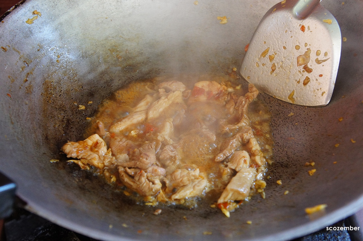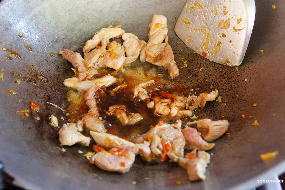 เริ่มสุกแล้วใส่เครื่องปรุง ซีอิ๊วดำ น้ำปลา น้ำตาลปลายๆช้อน