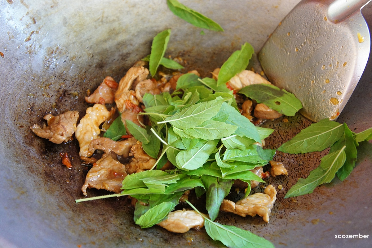 ปิดไฟเลยครับ โยนกะเพราลงไปเลย พลิกไปมา 3-4 ครั้งพอแล้ว