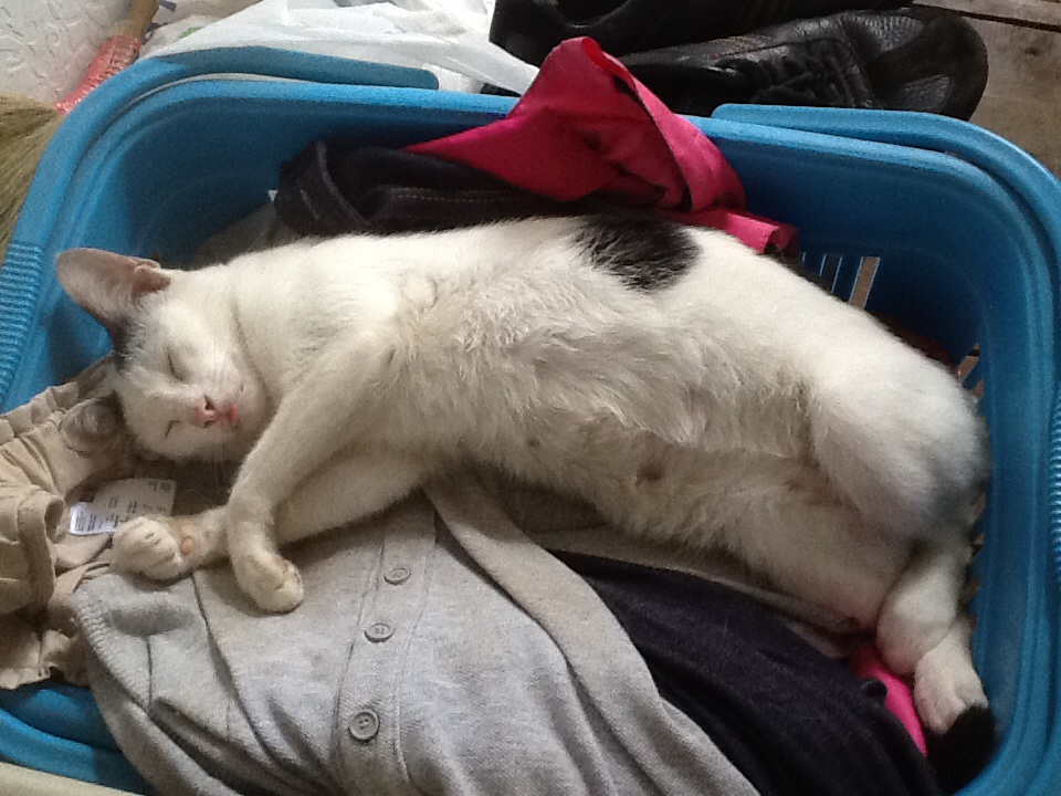 นี่รูปตอนทำหน้ามึน แอบขึ้นมานอนในตะกร้าผ้า หน้าห้องนอนชั้นบนซะงั้น