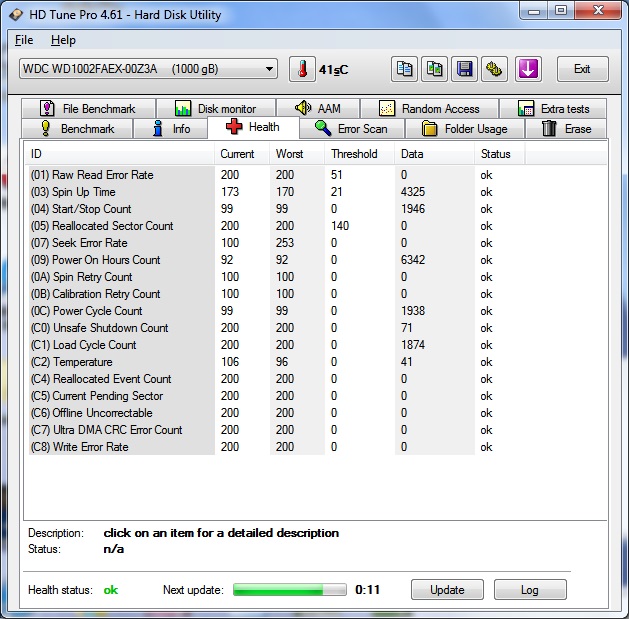 และ เมื่อใช้ HD Tune ตรวจ Harddisk ซึ่งใช้มานานราว 3 ปี ก็ได้ผลตามภาพนี้