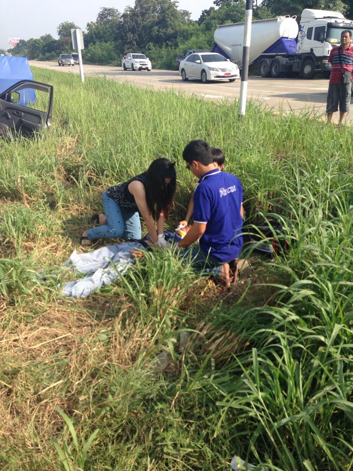 ระหว่างทางพี่เค้าเจอคนประสบอุบัติเหตุ ก็เลยลงไปช่วยเหลือปั๊มหัวใจให้ผู้บาดเจ็บ จนรถ 1669 มา