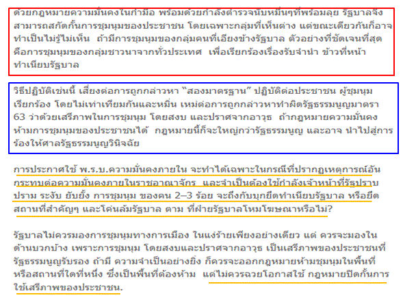 ยังไม่มีการชุมนุม รัฐบาลเร่งประกาศพรบ ความมั่นคง ปิดถนน ใ้กำลังตำรวจจำนวนหลายหมื่นนาย ทั้งที่ การชุมนุมอย่างสงบ ปราศจากอาวุธ ไม่ได้ทำลายความมั่นคงของรัฐ แต่อาจทำลายความมั่นคงของรัฐบาล ซึ่งไม่เข้ากฎของ