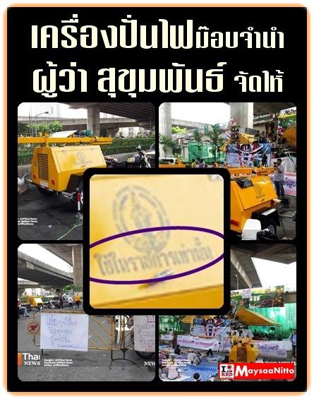 เครื่องปั่นไฟ หรืออุปกรณ์อำนวยความสะดวกม๊อบ ถ้าไม่ใช่ของส่วนตัวหม่อม ช่วยเก้บกลับคืนที่ด้วย มิฉะนั้นจะเป็นการใช้ของหลวงที่ซื้อโดยภาษีประชาชนโดยมิชอบ ถ้าของส่วนตัว แปะป้ายบอกด้วย ชาวอุรุพงษ์ เขาเอือมแล