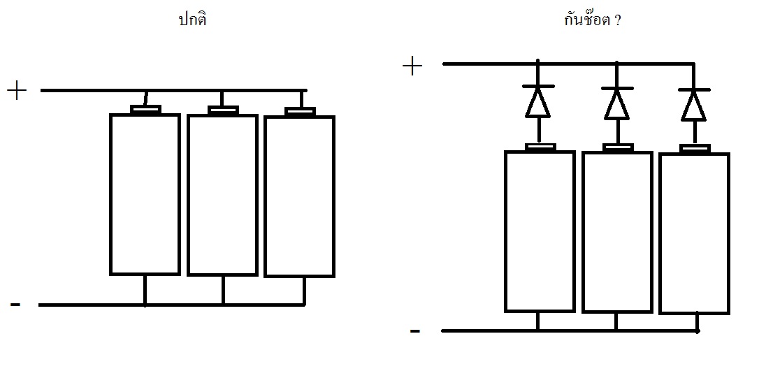 มีแบต 3 ก้อน (ลิเธียม 3.7 V) ต่อขนานเพื่อเพิ่มกระแส แต่เกรงว่าคราวไหนใส่ผิดขั้วมันจะช็อตเลยอยากป้องกัน
