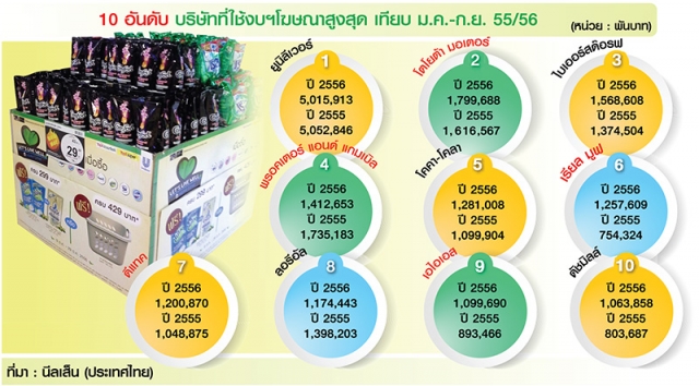 รายงานการใช้เม็ดเงินโฆษณาผ่านสื่อในรอบ 9 เดือนจากบริษัท นีลเส็น (ประเทศไทย) จำกัด ระบุว่า ทั้งยูนิลีเวอร์, พีแอนด์จี และลอรีอัล ต่างใช้งบฯโฆษณาลดลงเมื่อเทียบกับช่วงเดียวกันของปีที่แล้ว โดยเฉพาะยูนิลีเวอร์ ซึ่งปกติจะใช้งบฯโฆษณาเพิ่มขึ้นต่อเนื่อง