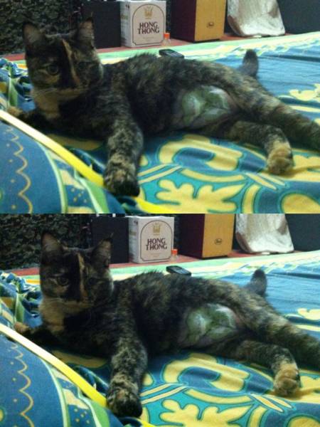 ตัวแรก นางเป็นแมวตัวเมียที่ถูกนำมาปล่อยทิ้งที่ทำงานพร้อมลูกกำลังโต ลูกน้อยกำลังโต ตกใจเผ่นกระเจิงไปคนละทิศคนละทาง ส่วนนางไปหลบซ่อนตัวอยู่วันกับคืน จึงออกมาขออาหารกิน เราเลยถือโอกาสพาเธอไปทำหมันและพั
