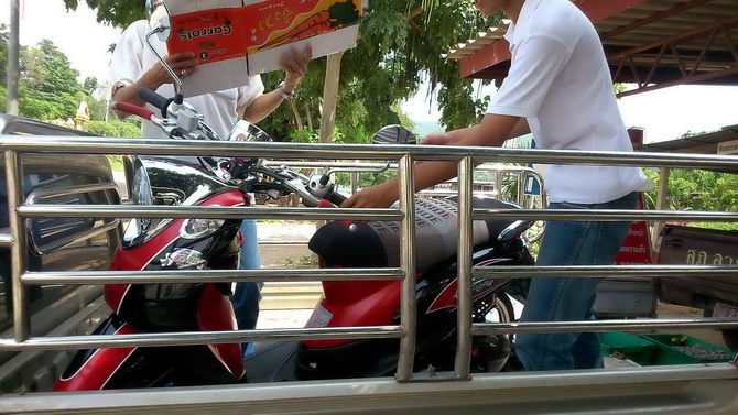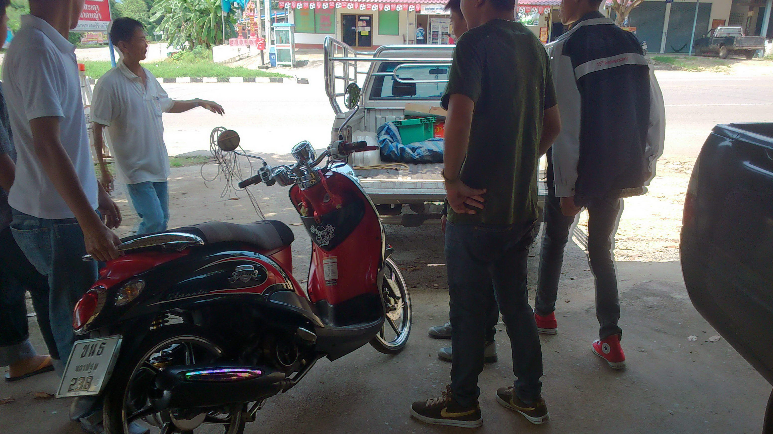 จึงได้ช่วยกันถีบรถคันนี้ลงไปหาร้านซ่อมด้านล่างเขา โชคดีครับที่มีร้านซ่อมอยู่ในระยะ1กิโลเมตร แต่ปัญหาที่เกิดมันเยอะครับ ร้านจึงไม่สามารถซ่อมได้ จึงต้องโทรเรียกรถมาเอารถกลับไป และเจ้าของฟีโน่ก็กลายสภาพมาเป็นผู้ซ้อนทันที