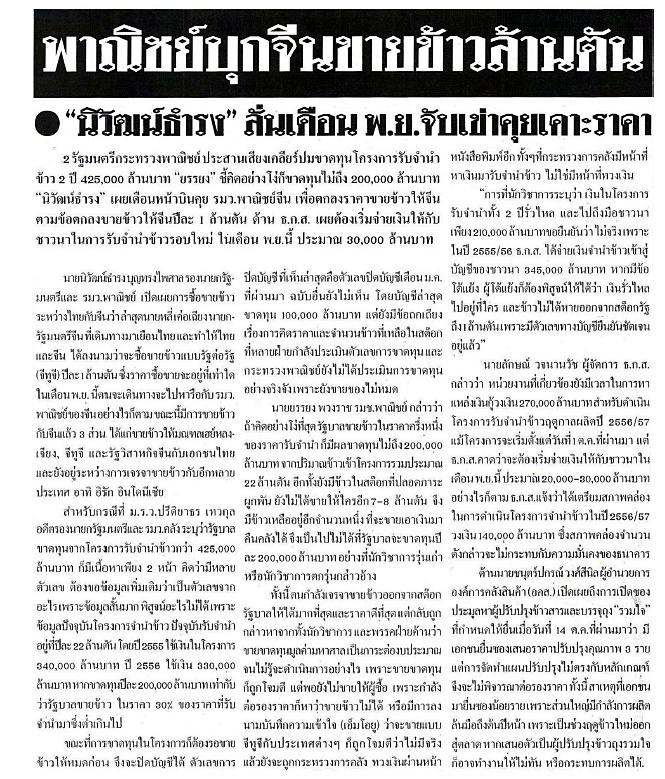 เบื้องหลังล้มสัญญาขายข้าวจีทูจี'ลวงโลก' โดย : กรุงเทพธุรกิจออนไลน์ เปิดเบื้องหลังยกเลิกสัญญาซื้อข้าวจีทูจีจากไทย 1.2 ล้านตัน เหตุ "เป่ยต้าฮวง" ถูกรัฐบาลจีนสอบ ไม่สามารถทำสัญญาจีทูจีกับไทยได