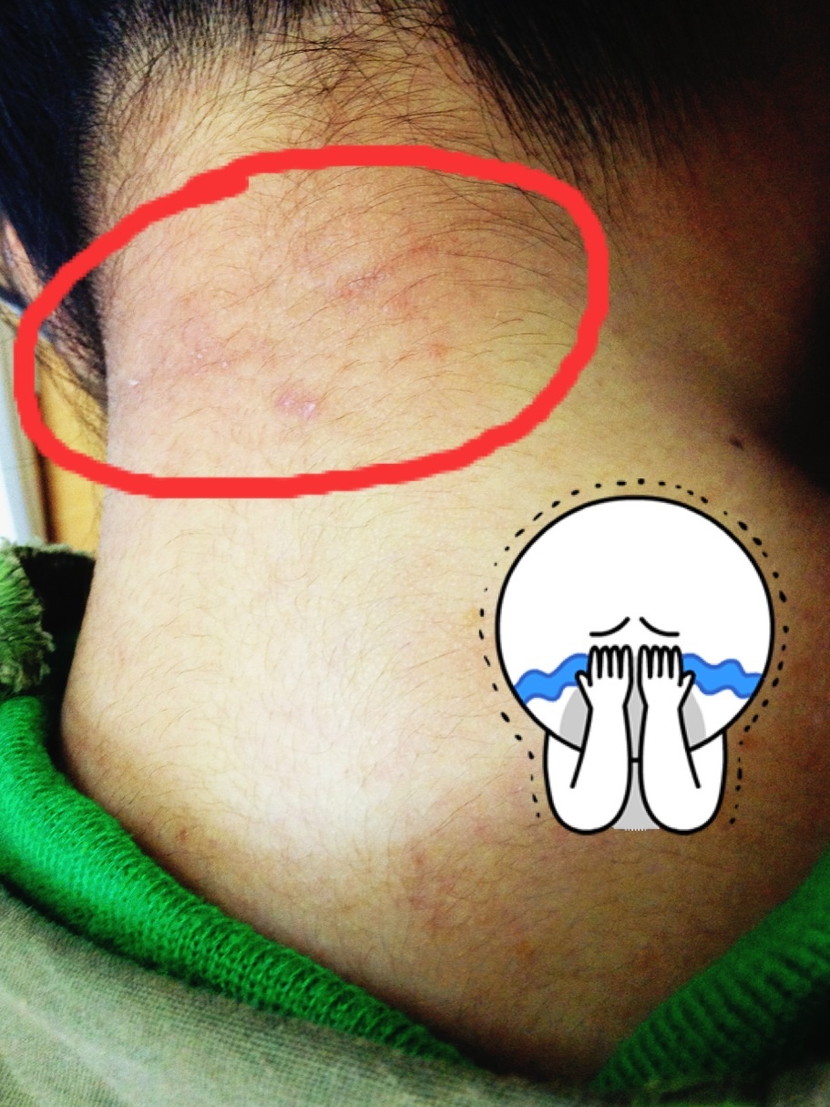 คือต้นคอมันเป็นแบบรูปอ่ะค่ะ ในส่วนที่วงกลมสีแดงนะค่ะ ไม่รู้ว่าเป็นอาการแพ้หรือเปล่า รูปนี้พยายามปรับแสงให้เข้มขึ้นเพื่อให้เห็นชัดเจน