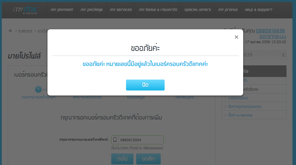 จะไป Add เบอร์ที่ 2 (ที่เคยสมัคร และใช้งาน e-Service อยู่แล้ว) ก็ไม่สามารถ Add ได้ เพราะว่า