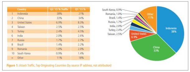 การโจมตีบนเครือข่ายอินเทอร์เน็ตจากอินโดนีเซีย เพิ่มขึ้นเป็นเท่าตัวในไตรมาสที่สองของปี 2013 นี้ ทำให้กลายมาเป็นแหล่งที่มาของการโจมตีบนโลกออนไลน์ที่มากที่สุดในโลก แทนที่สาธารณรัฐประชาชนจีน