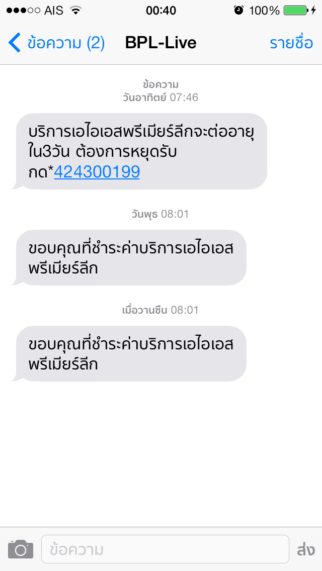 สมัครแพ็กเกจฟุตบอลพรีเมียร์ลีกผ่าน AIS (ระบบเติมเงิน) พอเปลี่ยนเป็นเป็นรายเดือนจู่ๆก็ดูไม่ได้ พอสมัครเข้าไปใหม่ก็มาเรียกเก็บเงินอีก พอโทรไปถามเมื่อวันที่ 17 สิงหาคม 68 จนท แจ้งว่าเบอร์สามารถสมัครได้คร