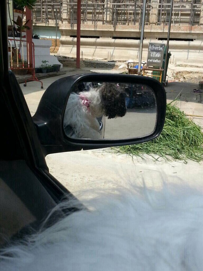 4. เดี๋ยวนี้หนูไม่ชอบวิ่งเล่นเหมือนเมื่อเดือนที่ผ่านๆมา หนูชอบนอนเหยียดตัวมองนู่นนั่นนี่ โดยเฉพาะนกกับกระรอกที่ชอบมาอยู่ตรงรั้วบ้าน และเมื่อหนูถูกสั่งให้รอหนูก็สามารถนั่งหรือนอนเหยียดตัวรอแบบนี้ได้เป็นเวลานานๆ ยิ่งตอนหนูนั่งรถเล่นแล้วเจออะไรที่หนูสนใจ (วัว รถตักดิน หมาตัวใหญ่) หนูจะกอดแขนแม่ ให้หยุดรถ