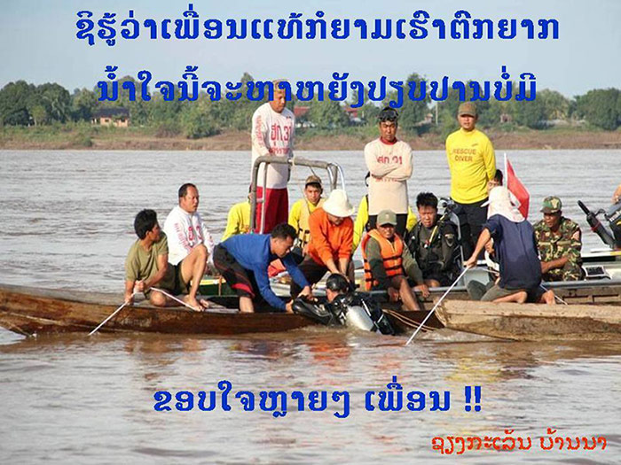 "ພວົກເຈົ້າເຫັນຫຼືຫຍັງວ່າ ຫມູ່ເເທ້ຂອງເຈົ້າຄືໄຜ ໃນຍາມເຈົ້າມີພັຍ ເເລ້ວ ອ້າຍເເທ້ເເທ້ຂອງເຈົ້າຫາຍຫົວໄປໄສລ່ະ ບໍມາສອຍນ້ອງເເນ່ ມີເເຕ່ປະເທດ ເພື່ອນບ້ານຢ່າງປະເທດໄທເເທ້ມາຊອຍນ່ະປານນັ້ນນ່ະວ່າເເຕ່ໄທບໍດີ ເຫັນ ໄປ໋ ບານນີ້ ເພື່ອນລາວເອີຍ" [พวกเจ้าเห็นหรือยังว่าเพื่อนแท้ของเจ้าคือใครในยามที่เจ้ามีภัย แล้วอ้าย (พี่) แท้ๆ ของเจ้าหายหัวไปไหนล่ะไม่มาช่วยน้อง มีแต่ประเทศเพื่อนบ้านอย่างประเทศไทยแท้ๆ ที่มาช่วย ป่านนั้นก็ยังว่าไทยนั้นไม่ดี เห็นหรือยังตอนนี้เพื่อนลาวเอ๋ย]