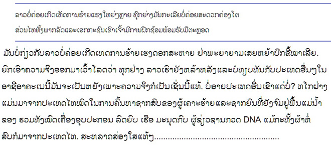 "ຈາກຕາມຂ່າວເຫດການເຄື່ອງບິນລາວໄດ້ປະສົບອຸບັດຕິເຫດທີ່ປາກເຊນັ້ນ,ສັງເກດເຫັນວ່າມີແຕ່ພີ່ນ້ອງທາງຝັ້ງໄທທີ່ໄດ້ສົ່ງຄວາມຊ່ວຍເຫຼືອຢ່າງເຕັມທີ່ໃນການຄົ້ນຫາຜູ້ປະສົບເຄາະຮ້າຍດັ່ງກ່າວ,ຂ້າພະເຈົ້າຂໍຂອບໃຈຢ່າງຍິ່ງທາງພີ່ນ້ອງຝັ່ງໄທທີ່ໃຫ້ການຊ່ວຍໃນຄັ້ງນີ້,ແຕ່ກົງກັນຂ້າມຄືບໍເຫັນ (xxxxxxx) ສົ່ງຫນ່ວຍກູ້ໄພ ຫຼື ສິ່ງໃດໆມາຊ່ວຍເລີຍ ປານນັ້ນວ່າສາຍສຳພັນ ແບບພິເສດ!!!!!!" อีกคนหนึ่งออกความเห็นด้วยความรู้สึกง่ายๆ ภาษาง่ายๆ แม้จะไม่แตกฉานในภาษาลาวผู้อ่านชาวไทยทั่วไปก็สามารถจับความได้ไม่ยาก