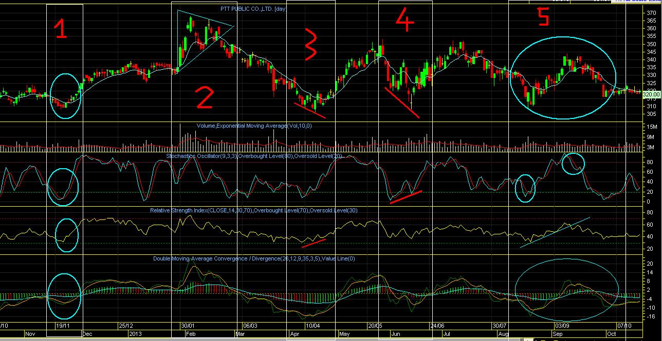 ช่วงที่4. เนื่องจากในช่วงที่3 ผมลืมตีเส้นสีแดงบ่งบอกสัญญาณ DIVERGENCE ของ STO ให้ดู ช่วงนี้ผมเลยเอามาให้ดูแทน เป็นรูปแบบเดียวกันนะครับ คือ ราคาทำ new low (lower low) แต่ indicator (STO) ไม่ทำ new low (higher low) ตามไปด้วย นั่นแปลว่ากำลังจะเกิดการกลับตัวของแนวโน้มในไม่ช้า เช่นเดียวกัน