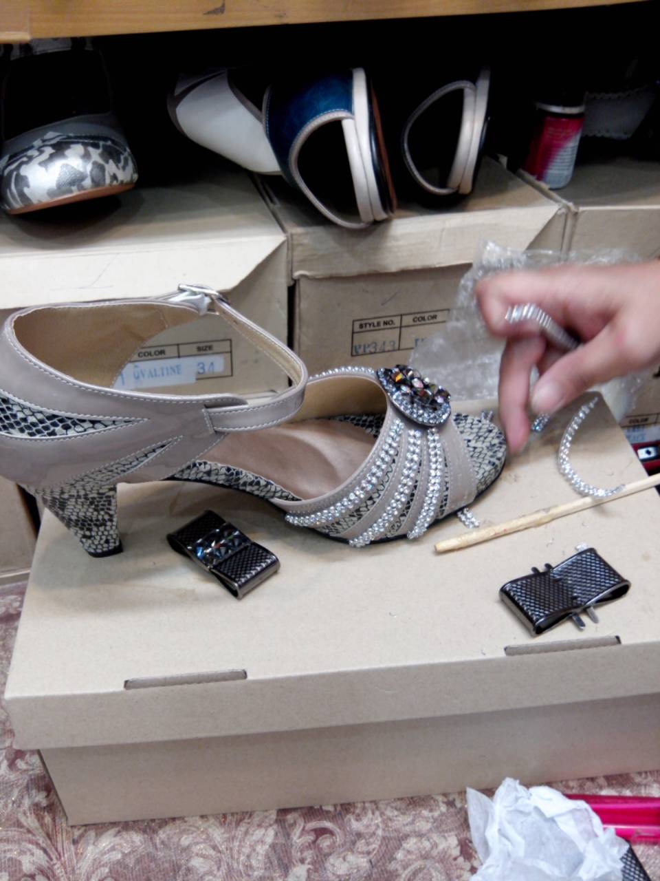 แล้วพี่เค้าก็เริ่มออกแบบให้ หยิบโน้นนี้มาให้ดู แล้วก็ลงมือแปลงโฉมรองเท้าให้เรา