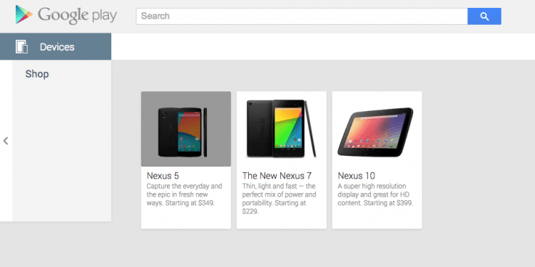 ยากที่จะเก็บไว้เป็นความลับอีกต่อไป เมื่อ Nexus 5 ได้ปรากฎโฉมให้เห็นผ่านทางร้านค้าออนไลน์ Google Play พร้อมเปิดเผยราคาให้ได้ทราบกัน (รุ่น 16 GB ในราคา 349เหรียญสหรัฐฯ) โดยมีราคาเท่ากับ Nexus 4 รุ่น 16 GB เมื่อครั้งแรกที่เปิดตัว