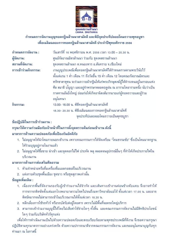 กำหนดงานลอยยี่เป็งเชียงใหม่ ณ.ธุดงสถานล้านนา อ.สันทรายเชียงใหม่ จัดงานวันเสาร์ที่ 16 พฤศจิกายน 2556