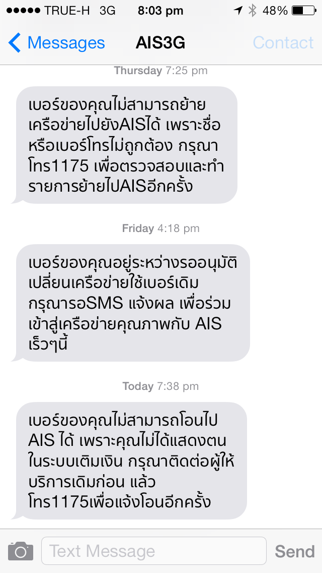 ๒) AIS ส่ง SMS มาว่าเบอร์ผมเป็นระบบเติมเงินยังไม่เคยลงทะเบียน .... ผมจ่ายรายเดือน นะขอรับ