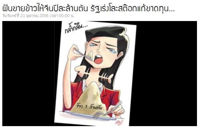 ประกอบกับข้อ มูลส่งออกข้าวไปจีนจริง ๆ ในแต่ละปีพบว่าไม่มากอย่างที่รัฐบาลแอบอ้าง โดยปี 52 มีปริมาณเพียง 328,238 ตัน, ปี 53 ปริมาณ 264,207 ตัน, ปี 54 ปริมาณ 267,841 ตัน, ปี 55 ปริมาณ 143,082 ตัน ขณะที่ในช่วง 8 เดือนของปี 56 (ม.ค.-ส.ค.) มีการส่งออก 110,742 ตัน ซึ่งหากเทียบสถิติในช่วงของรัฐบาล น.ส.ยิ่งลักษณ์ จะพบว่า การส่งออกกลับน้อยลง ที่สำคัญ...ยังได้ไม่ถึงครึ่งหนึ่งของหลักล้านตันด้วยซ้ำไป