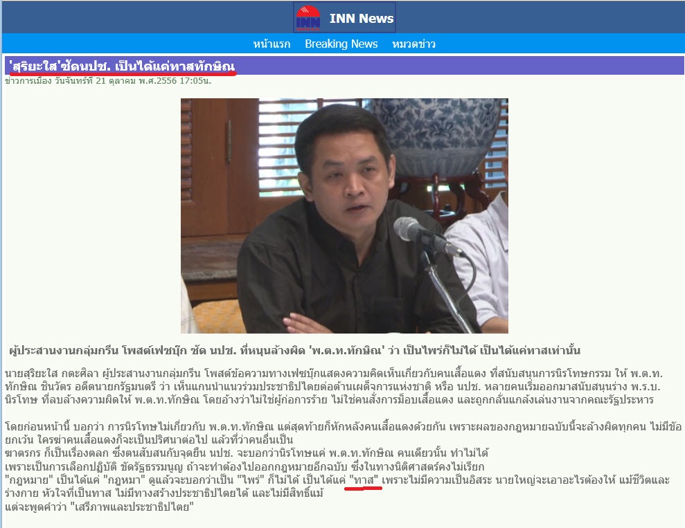 รวบรวมข่าวจากเว๊บสลิ่มจำนวน 3 ข่าว ข่าวแรก พณฯ ท่านสุริยะใส(ว่าที่นายกรัฐมนตรี) กล่าวว่า นปช. เป็นแค่"ทาส"
