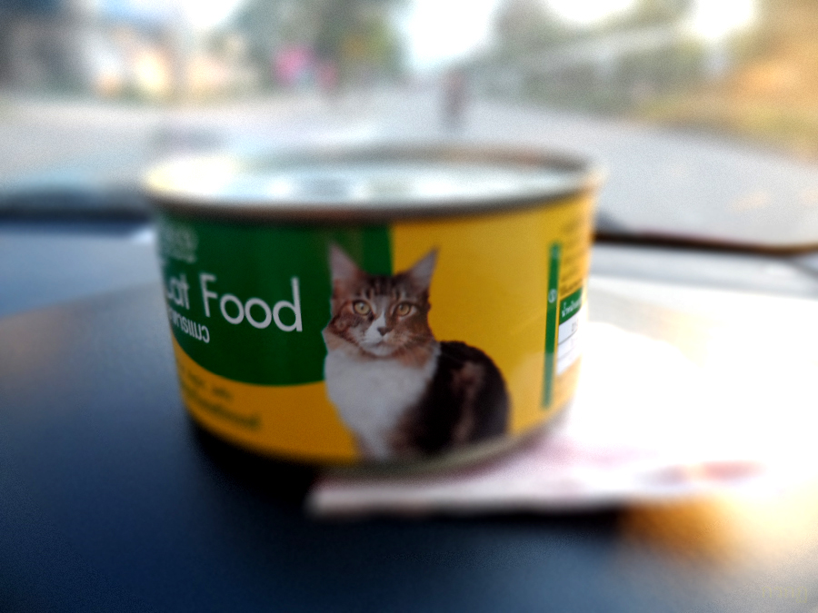 คุณป้าผู้เป็นแม่ค้นถุงกรอกแกรก ๆ หยิบอาหารแมวมาให้กระป๋องหนึ่ง ... เอาไปให้ลูกแมวกิน