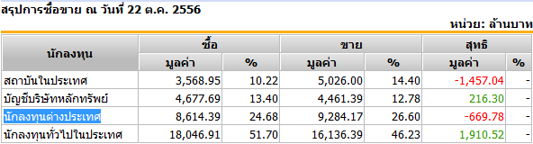 สรุปการซื้อขาย ณ วันที่ 22 ต.ค. 2556