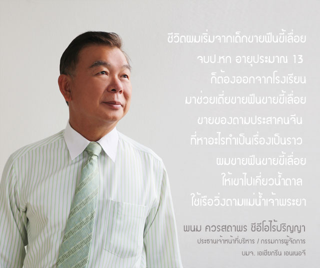 เช่นเดียวกับ ‘พนม ควรสถาพร’ ซีอีโอกระดูกเหล็กแห่ง เอเชีย กรีน เอนเนอจี (AGE) ผู้นำเข้าและจำหน่ายถ่านหินบิทูมินัส (ถ่านหินสะอาด) ผู้ยังคงยืนหยัดเป็นผู้นำที่แข็งแกร่งขององค์กรในวัยที่นำหน้าด้วยเลขหก โดยยังไม่มีทีท่าว่าจะอ่อนล้า แม้จะเคยผ่านวิกฤตหนักหน่วงในธุรกิจถ่านหินที่ฝากบาดแผลไว้มากมาย แต่ พนม ควรสถาพร หรือ เสี่ยง้วน เจ้าของฉายา ‘ซีอีโอไร้ปริญญา’ หรือ ‘ซีอีโอป.7’ ที่สื่อมวลชนเรียกขาน (ซึ่งวันนี้คงเป็นอดีตไปแล้วเพราะเสี่ยง้วนเรียนเพิ่มจนคว้าดีกรีมามากมาย) ก็ยังเดินหน้านำทัพฝ่าฟันอุปสรรคไปอย่างไม่ย้อท้อ แต่หากมองย้อนให้ลึกไปถึงประวัติชีวิตที่น่าทึ่งตั้งแต่วัยเยาว์ จากวันที่เคยเป็น ‘ไอ้ตี๋ขี้กบ’ พายเรือช่วยเตี่ยขายฟืนขายขี้เลื่อยอยู่ตามคลองในสมุทรปราการ จนมาถึงวันที่เป็นซีอีโอของบริษัทมหาชนในตลาดหลักทรัพย์ ณ วันนี้ อาจไม่ใช่เรื่องเหลือเชื่อหรือต้องอาศัยปาฏิหาริย์อันใดเลยหากลูกผู้ชายเลือดนักสู้อย่าง พนม ควรสถาพร จะนำพาความสำเร็จที่ยิ่งใหญ่กว่าเดิมกลับคืนมาสู่อาณาจักรธุรกิจของเขาอีกครั้งหนึ่ง ตราบเท่าที่ยังมีกำลังแรงกายแรงใจและมีแรงสนับสนุนเป็นเหล่าทายาทรุ่นใหม่ที่กำลังเข้ามาสานต่อสร้างอนาคตขององค์กร