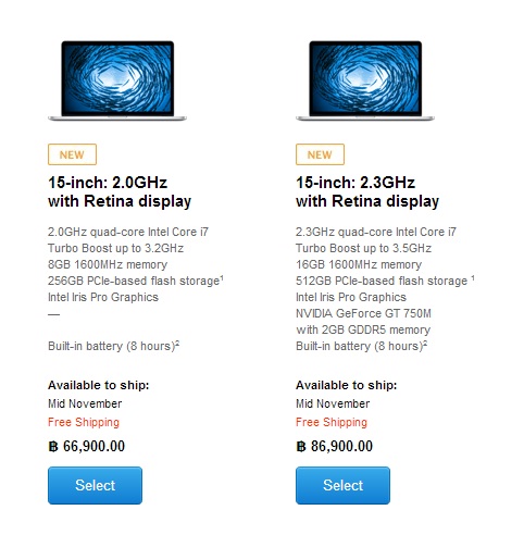 รุ่นปลายปี 2013 (ล่าสุด) 15-inch: 2.0GHz with Retina display Specifications 2.0GHz quad-core Intel Core i7 Turbo Boost up to 3.2GHz 8GB 1600MHz memory 256GB PCIe-based flash storage1 Intel Iris Pro G