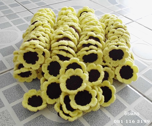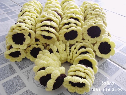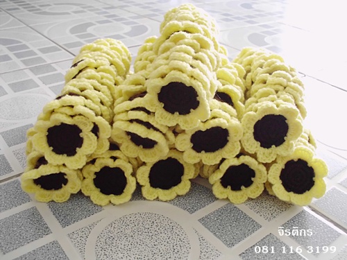 ไหมพรมนุ่มๆ ฟูๆ ถักเป็นดอกทานตะวัน เน้นโทนเหลือง