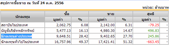 Sinthorn Summary 24/10/2556 : ต่างชาติซื้อสุทธิ 245.86 ลบ.