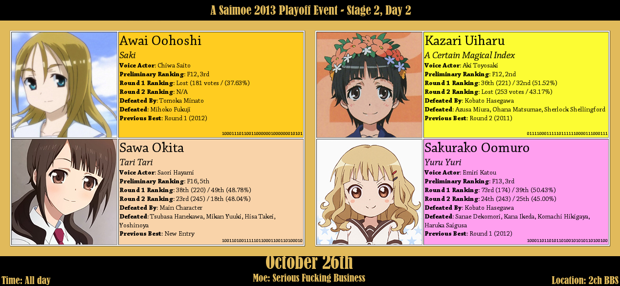 ผลรอบเพลย์ออฟนัดแรกมาแล้ว(ผลทางการ) โทกิกับอลิสฉลุยเลย... รอบลึกๆมีตัดคะแนนเฟคโหวตซะผลเปลี่ยนเลย FL 1 1st 151 Onjouji Toki @ Saki Zenkoku-hen 2nd 80 Alice Cartelet @ Kin’iro Mosaic 3rd 74 Ooho