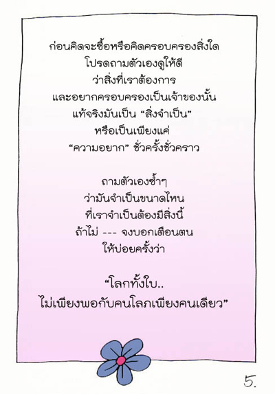 บางคนมีกำลังพอ ก็สามารถซื้อหาในสิ่งที่ปรารถนาได้เสมอๆ แต่บางครั้งเราอาจลืมไปว่า ของบางอย่างไม่ใช่เรื่องสำคัญและจำเป็นกับชีวิต บางอย่างเป็น "ความต้องการ" ขณะที่บางสิ่งเป็นเพียงแค่ "ความอยาก" ที่เกิดขึ้นแค่ชั่วครั้งชั่วคราวเท่านั้น