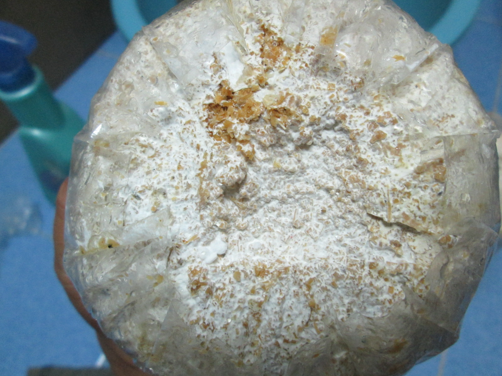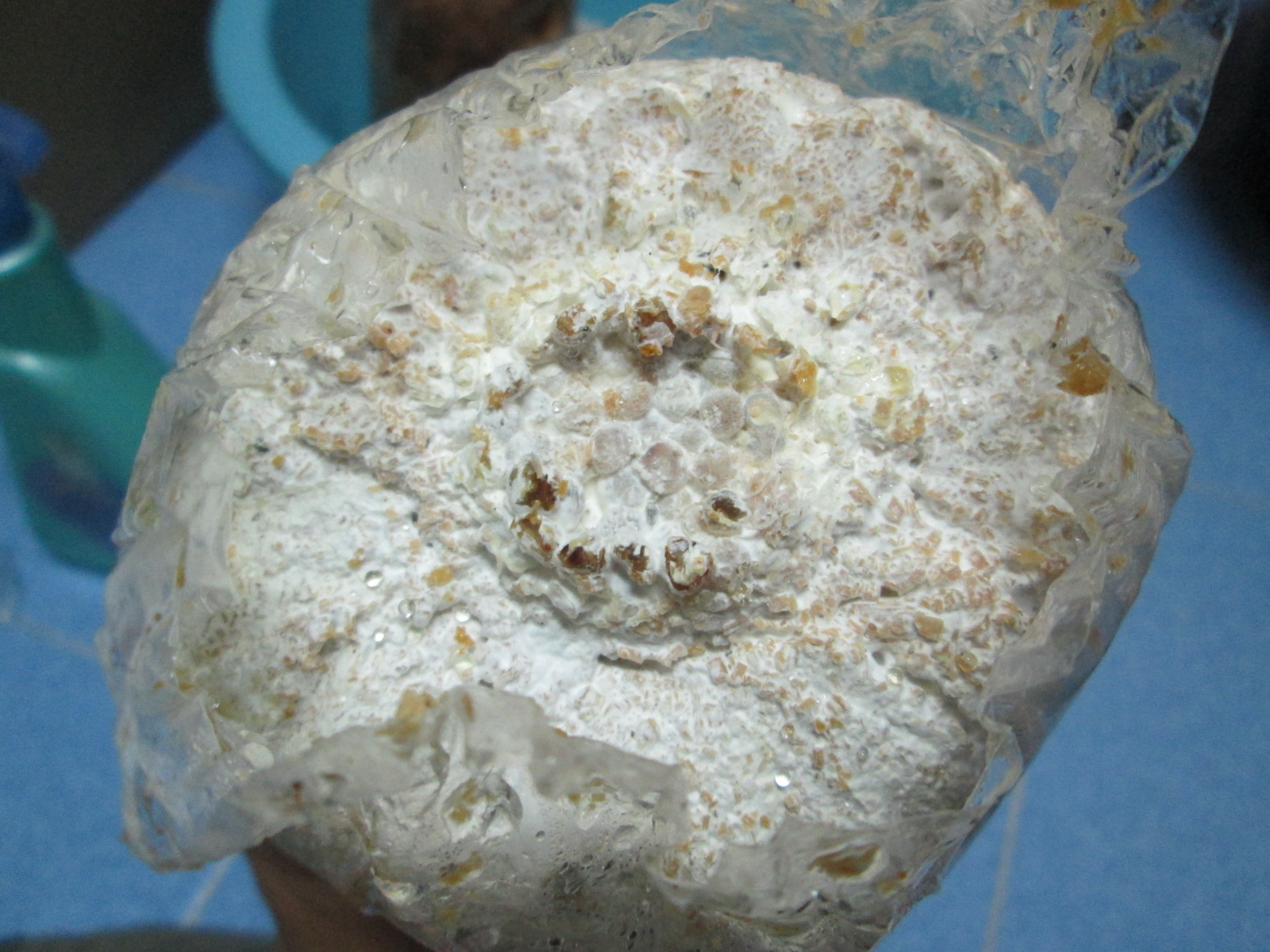 เปิดก้อนเชื้อเห็ดนางฟ้ามา 3 วันแล้วยังไม่ออกดอกเลย ภายในก้อนเชื้อก็เป็นราสีเหลืองๆ แล้วเหมือนไอน้ำเกาะที่ถุงทำไงดีค่ะ
