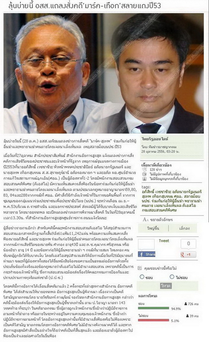 วันที่ 25 กันยายน พ.ศ. 2556 เวลา 14:58 น. ข่าวสดออนไลน์ อัยการเลื่อนสั่งคดี “มาร์ค-สุเทพ” เหตุสลายการชุมนุมนปช.ปี 53 วันที่ 25 กันยายน ที่สำนักงานอัยการสูงสุด ถ.รัชดาภิเษก นายรุจ เขื