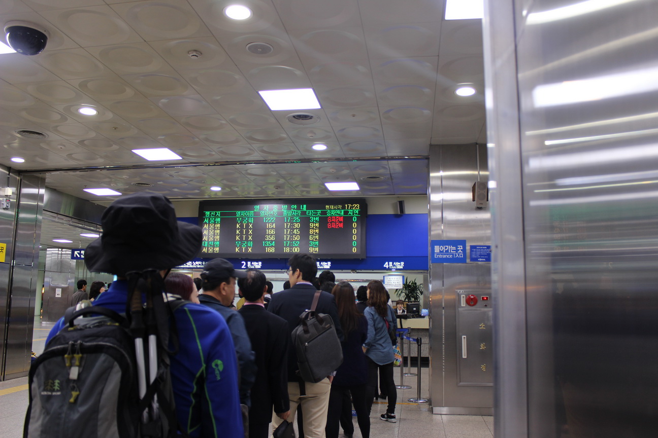 ง่ายๆเลยนะคะ ขึ้นซับเวย์มาลงที่สถานี Busan station หาทางออกที่เขียนว่า Busan station ได้เลยค่ะ เดินขึ้นบันไดไปเร๊ยยย จะมาโผล่ตรงหน้าสถานี KTX เลยจ้า หาง่ายมากๆ จากนั้นก็รีบดิ่งตรงเข้าไปในสถานี KTX กันค่ะ ขึ้นไปชั้น 2 ต่อแถวซื้อตั๋วกันค่ะ