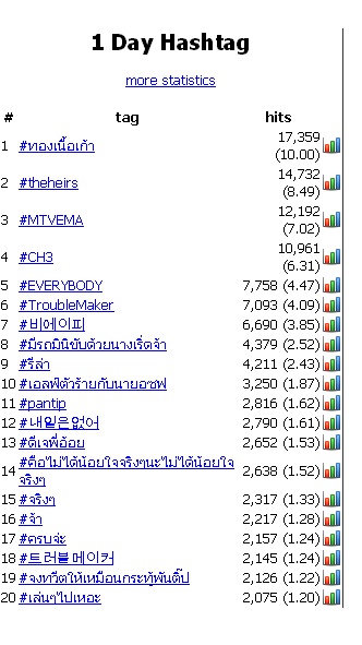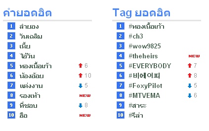 ติดคำยอดฮิตเป็นแผงเลย แถม #Ch3 กับ #ทองเนื้อแก้วอยุ่ที่ 1 กับ 2 ด้วย อีกเว็บนึง คนทวิตติดแท๊ก #ทองเนื้อเก้า เกือบ หกหมื่นสุดยอดอ่ะ Cr.zanroo และ Thaitrend