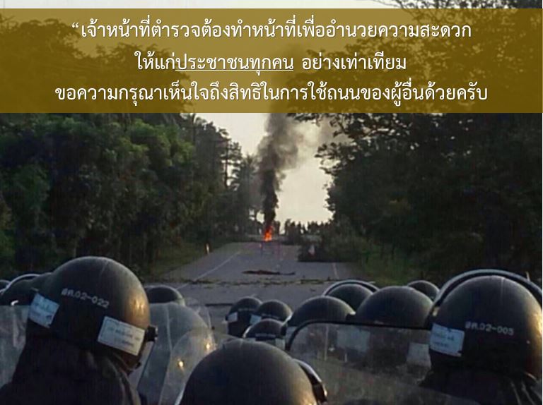 และกำลังเจ้าหน้าที่ตำรวจ(ชุด ปจ.)ชุดที่ ๒ จำนวน ๑ กองร้อย ปฏิบัติการเคลียพื้นที่จากใต้- เหนือ เข้าประชิดใกล้กลุ่มผู้ชุมนุมประมาณ ๑ กิโลเมตร สามารถเคลียสิ่งกีดขวางซึ่งเป็นต้นไม้ที่กลุ่มผู้ชุมนุมใช้ปิดถนนได้จำนวน ๔ ต้น