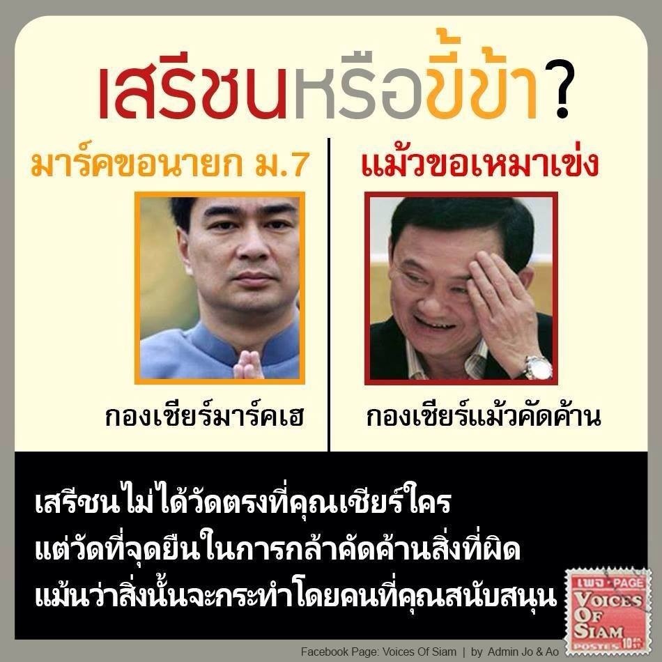 ในทางกลับกันต้องย้อนถามไปที่กลุ่มคนที่เย้ยหยันเสื้อแดงตลอดมาว่าเป็นขี้ข้าบ้าง รับเงินทักษิณบ้าง ฯลฯ ในยามที่คนที่คุณอาจจะนิยมชมชอบอย่างอภิสิทธิ์ เวชชาชีวะ ทำอะไรที่ผิดหลักการมากๆ อย่างเช่น การขอนายกพระราชทานมาตรา 7 ณ ขณะนั้นมีผู้สนับสนุนคุณอภิสิทธิ์จำนวนกี่มากน้อยที่ออกมาคัดค้าน?
