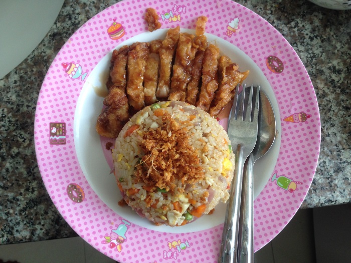 ข้าวผัดไข่กับไก่กรอบราดซอสเทริยากิ