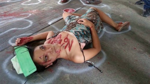 โดยได้นอนลงที่พื้นหน้าพรรคเพื่อไทย บนพื้นเต็มไปด้วยสีสเปรย์คล้ายสีพ่นที่บริเวณเกิดอุบัติเหตุ นอกจากนี้ยังมีสีเลือดกระจายเต็มพื้นอีกด้วย โดยเธอระบุบนหน้าเฟซบุ๊คว่า สีบนตัวล้างออก แต่เลือดประชาชนล้างยังไงก็ไม่มีทางออก ซึ่งการประท้วงดังกล่าวเป็นการต่อต้านเชิงสัญลักษณ์ว่าไม่เห็นด้วยกับการผ่านร่างนิรโทษกรรมสุดซอยหรือเหมาเข่งที่เพิ่งมีการผ่านวาระ3 เมื่อช่วงเช้ามืดที่ผ่านมา