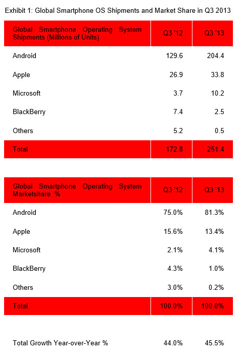 ส่วนแบ่งตลาดไตรมาส 3 : Android แตะ 81%, iPhone ลดเหลือ 13%, Windows Phone ขายได้ 10 ล้านเครื่องแล้ว